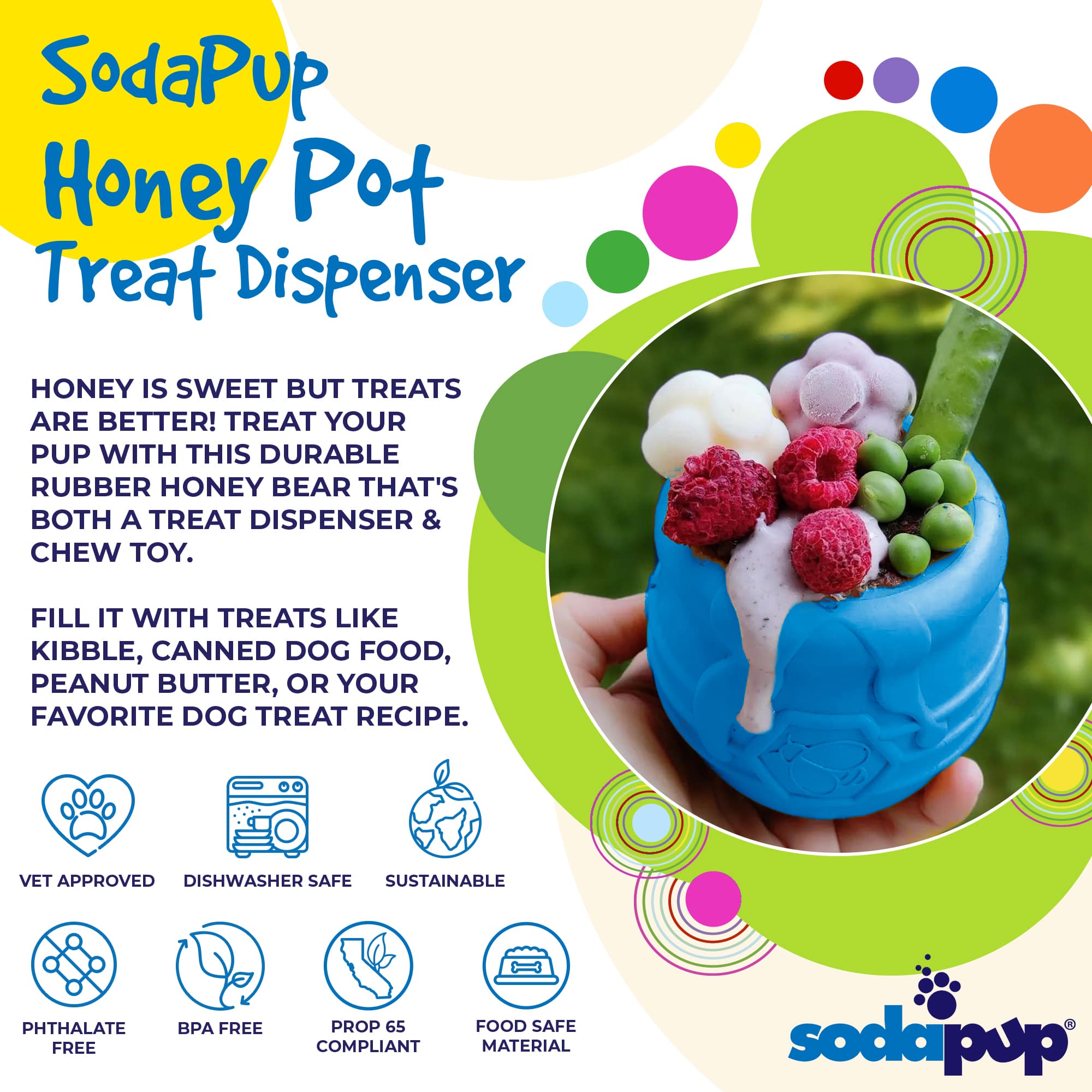 DISPENSES TREATS: Help your dog fight boredom by filling the Honey Pot with treats like kibble, canned dog food, peanut butter, or your favorite dog treat recipe. Best results: mix wet/dry foods. Freeze with treats inside to prolong use.